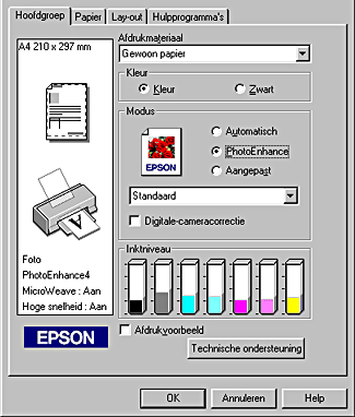 U kunt de kleurdichtheid zelf aanpassen. Gebruik een waarde van -50% tot +20%. De standaardinstelling is 0. Sleep het schuifblok met de muis naar het plusteken (+) als u de kleur van de afdruk donkerder wilt maken en naar het minteken (-) als u de kleur lichter wilt maken. U kunt ook rechtstreeks een waarde invoeren (-50 tot +20) in het vak naast de schuifbalk. Gebruik deze functie wanneer u afdrukt op papier dat geen speciaal afdrukmateriaal van EPSON is.
