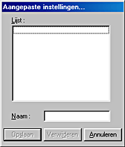 Als u uw instellingen in het dialoogvenster Aangepaste instellingen wilt opslaan in de lijst Aangepaste instellingen, klikt u in het dialoogvenster Aangepaste instellingen op Instellingen opslaan. Het dialoogvenster Aangepaste instellingen wordt dan weergegeven.