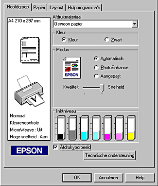 Als u een afdruktaak naar de printer stuurt, wordt het venster EPSON-afdrukvoorbeeld geopend, zodat u wijzigingen kunt aanbrengen voordat de taak wordt afgedrukt.