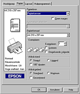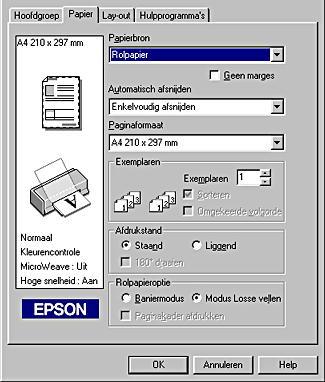 Wanneer u Rolpapier selecteert als papierbron, zal de printersoftware er als volgt uitzien.