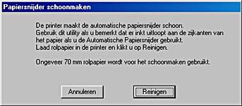 Met het hulpprogramma Snijmechanisme Reinigen wordt het mes van het snijmechanisme schoongemaakt. U moet het mes reinigen wanneer u bemerkt dat het uiteinde van een afgesneden pagina vlekken vertoont. Met dit hulpprogramma kunt u het snijmechanisme reinigen.