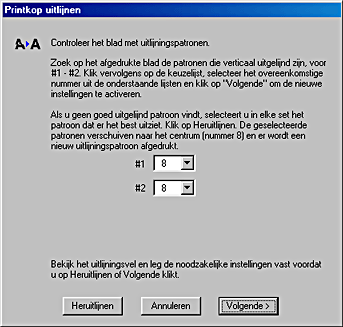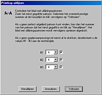 | Als u geen enkel mooi effen patroon kunt vinden, selecteer dan het nummer van het patroon dat het minst korrelig overkomt en klik op Heruitlijnen. Het testblad wordt opnieuw afgedrukt. Als u een mooi effen patroon kunt selecteren en het testpatroon niet opnieuw hoeft af te drukken, schakel dan de selectievakjes #1 tot #3 aan de rechterzijde uit. |