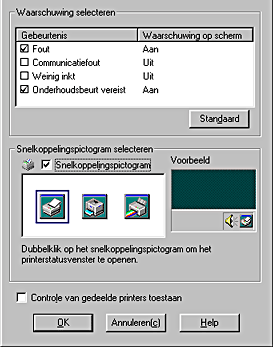 Klik op deze knop om het dialoogvenster Controlevoorkeursinstellingen te openen, waarin u instellingen kunt vastleggen voor EPSON Status Monitor 3.