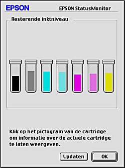 U kunt dit programma ook gebruiken om vóór het afdrukken het inktniveau te controleren. EPSON StatusMonitor toont hoeveel resterende inkt er nog is op het moment dat u het programma hebt geopend. Als u de informatie over de hoeveelheid resterende inkt wilt actualiseren, klikt u op de knop Updaten .