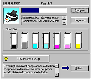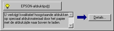 In het tekstvak onderaan het venster van de voortgangsbalk worden tips weergegeven voor een optimaal gebruik van uw EPSON-printersoftware. Er verschijnt een nieuwe tip om de 30 seconden. Als u meer informatie wilt over een tip die wordt weergegeven, klikt u op Details.