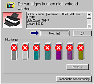 Als de inkt (bijna) op is, verschijnt onder het tekstvak een knop Hoe. Als u op Hoe klikt, wordt u door EPSON Status Monitor 3 stap-voor-stap begeleid bij de procedure voor het vervangen van de cartridge.