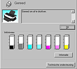 EPSON Status Monitor 3 biedt uitgebreide informatie over de printerstatus, een grafische weergave en statusberichten. Als de inkt (bijna) op is, verschijnt de knop Hoe in het venster van EPSON Status Monitor 3. Als u op Hoe klikt, worden er instructies weergegeven voor het vervangen van de cartridge en wordt de inktkop naar de positie verplaatst waar u de cartridge kunt vervangen.
