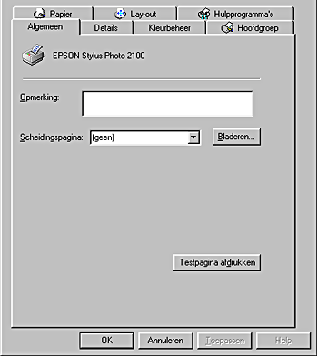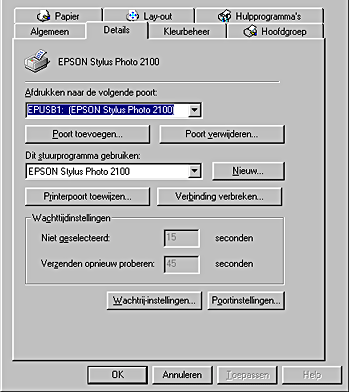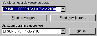 Als EPUSBx: (EPSON Stylus Photo 2100) wordt weergegeven in de keuzelijst Afdrukken naar de volgende poort (Print to the following port), dan zijn de driver voor de USB-printer en de printersoftware goed geïnstalleerd. Als de juiste poort niet is geïnstalleerd, gaat u door met de volgende stap.