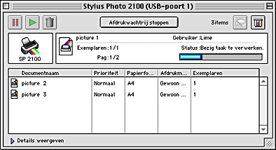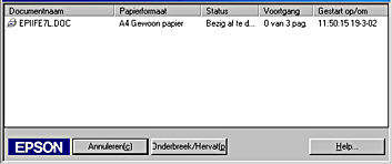 EPSON Spool Manager is vergelijkbaar met Afdrukbeheer onder Windows. Als twee of meer afdruktaken tegelijk worden ontvangen, worden deze vastgehouden in de volgorde waarin ze zijn ontvangen. (Bij printers in een netwerk wordt dit een afdrukwachtrij genoemd.) Als een afdruktaak bovenaan komt te staan, wordt deze door EPSON Spool Manager naar de printer gestuurd. Via de Spool Manager kunt u afdruktaken annuleren. Van de afdruktaken die naar de printer zijn gestuurd kunt u de status weergeven, u hebt de mogelijkheid om afdruktaken te onderbreken en te hervatten of u kunt ze opnieuw starten.