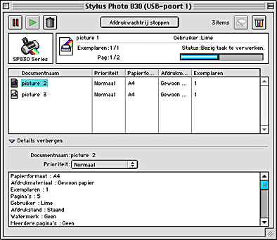 Nadat u een afdruktaak naar de printer hebt gestuurd, kunt u met behulp van het hulpprogramma EPSON Monitor3 afdruktaken die in de wachtrij staan, bekijken, annuleren of van volgorde wijzigen. Het hulpprogramma toont bovendien de status van de huidige afdruktaak.