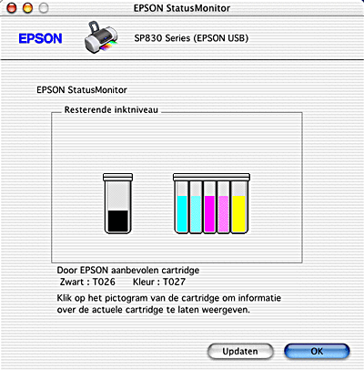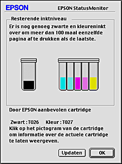 U kunt dit programma ook gebruiken om vóór het afdrukken het inktniveau te controleren. EPSON StatusMonitor toont hoeveel resterende inkt er nog is op het moment dat u het programma hebt geopend. Als u de informatie over de hoeveelheid resterende inkt wilt actualiseren, klikt u op Updaten.