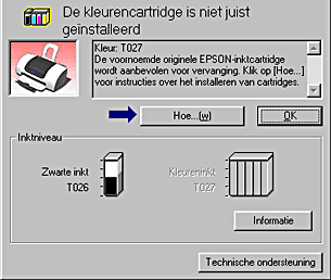 Als de inkt (bijna) op is, verschijnt onder het tekstvak een knop Hoe. Als u op Hoe klikt, wordt u door EPSON Status Monitor 3 stap-voor-stap begeleid bij de procedure voor het vervangen van de cartridge.