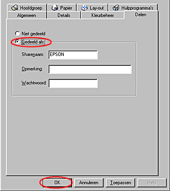 Selecteer Gedeeld als (Shared As), voer de printergegevens in en klik op OK.