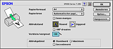 In het dialoogvenster voor de pagina-instelling kunt u het papierformaat wijzigen, de afdrukstand opgeven, het document 180° draaien, de afdruk groter of kleiner maken en het afdrukgebied aanpassen.