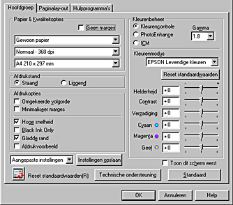 Deze instelling schakelt het bidirectioneel afdrukken in. Dit wil zeggen dat de printer zowel van links naar rechts als van rechts naar links afdrukt. Met Hoge snelheid wordt sneller afgedrukt, maar wel met een lagere kwaliteit.