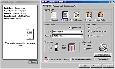 ![]() | Stel de Afdrukkwaliteit in bij Opties voor papier en kwaliteit. |