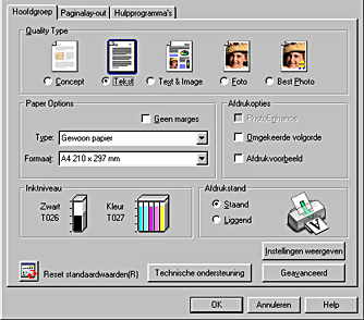 Via het tabblad Hoofdgroep kunt u de instellingen vastleggen voor Kwaliteitstype, Papieropties, Afdrukopties, Afdrukstand en Geavanceerde instellingen. Ook kunt u hier de inktniveaus controleren. Raadpleeg het betreffende gedeelte hierna.