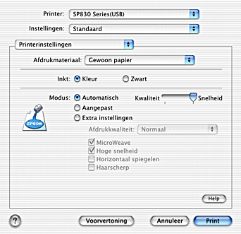 De instellingen bij Modus in het afdrukvenster (wanneer de optie Printerinstellingen is geselecteerd) ondersteunen diverse opties. Het afdrukvenster met de optie Printerinstellingen geselecteerd ziet u hier: