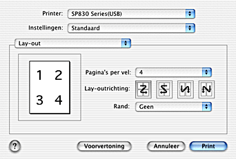 Selecteer in het venstermenu de optie Lay-out als instelling bij Meerdere pagina's als u meerdere pagina's van uw document wilt afdrukken op één vel papier.