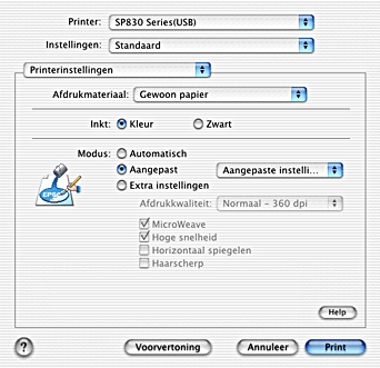 Deze modus maakt het mogelijk om gedetailleerdere instellingen te kiezen voor het afdrukken. Zie De modus Extra instellingen gebruiken voor meer informatie. |