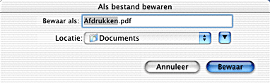![]() | Selecteer Uitvoeropties in het venstermenu en schakel het selectievakje Bewaar als bestand in. De knop Print verandert in de knop Bewaar (Save). |