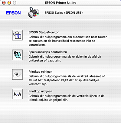 Als u de hulpprogramma's wilt gebruiken, dubbelklikt u op het pictogram van het EPSON-printerhulpprogramma in de programmamap in Macintosh HD (standaardinstelling) en klikt u vervolgens op de knop van het gewenste hulpprogramma.