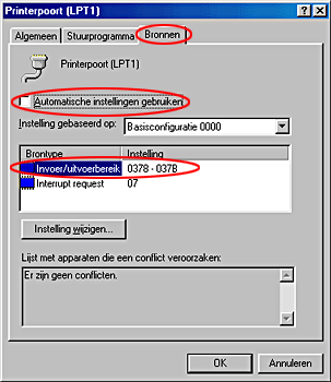 ![]() | Selecteer in de lijst Instelling gebaseerd op (Setting based on) een basisconfiguratie die dezelfde instelling voor Invoer-/uitvoerbereik (Input/Output Range) heeft als de instelling die u in stap 4 hebt genoteerd. Zorg er bovendien voor dat het kanaal voor Directe geheugentoegang (Direct Memory Access channel) en de nummers voor Interrupt request zijn toegewezen en worden weergegeven. In de lijst met apparaten die een conflict veroorzaken dient Er zijn geen conflicten (No conflicts) te worden weergegeven. |