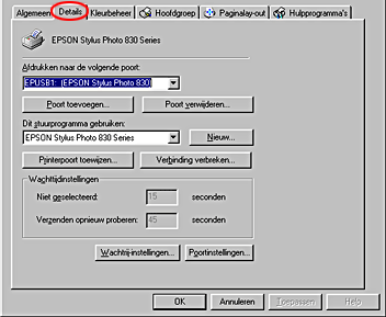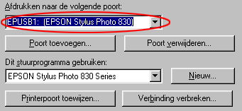 Als EPUSBx: (EPSON Stylus Photo 830) wordt weergegeven in de keuzelijst Afdrukken naar de volgende poort (Print to the following port), dan zijn de printerdriver voor de USB-printer en de printersoftware goed geïnstalleerd. Als de juiste poort niet is geïnstalleerd, gaat u door met de volgende stap.