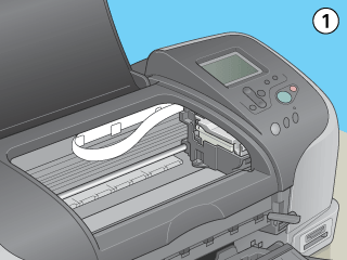 Druk op Customknop 1. De printkop verplaatst zich en het inkttoevoersysteem wordt geladen. Wanneer de inkt is geladen, gaat de printkop terug naar de uitgangspositie.