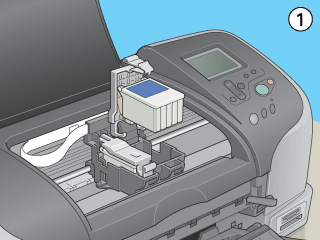 Volg de instructies op het scherm en druk op Customknop 1. De cartridge beweegt langzaam naar de positie waarin de cartridge kan worden vervangen.