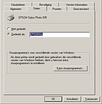 Als u wilt dat Windows 2000 of XP automatisch alle printerdriver's naar computers met verschillende versies van Windows stuurt, klikt u op Extra stuurprogramma's (Additional Drivers) en selecteert u de omgeving en het besturingssysteem van de andere computers. Klik op OK en plaats de cd-rom met printersoftware in de cd-romlezer. Selecteer WIN9X voor Windows Me en 98. Klik op OK om de extra drivers te installeren.