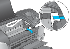 ![]() | Open de printerkap opnieuw. Plak de houder van de cartridges met plakband vast (zie afbeelding) en sluit de kap. |