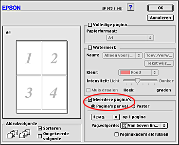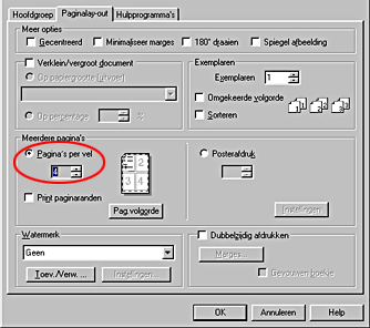 Hiermee worden meerdere pagina's van uw document afgedrukt op één vel papier. U kunt kiezen uit 1, 2, 4, 6, 9 en 16.
