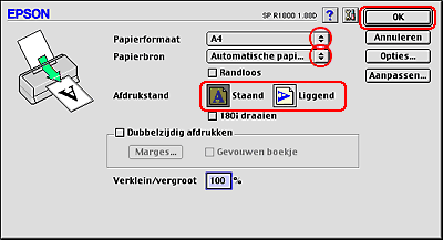 Selecteer Staand (verticaal) of Liggend (horizontaal) om de afdrukrichting te wijzigen.