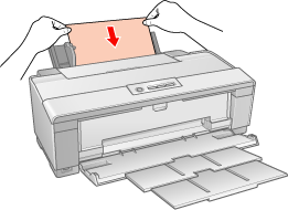 Schuif het papier in de handmatige papiertoevoer aan de achterzijde tot u enige weerstand voelt. Blijf het papier circa drie seconden aandrukken totdat u voelt dat het papier in de printer wordt getrokken. Laat het papier los. De printer kan de papierpositie nu aanpassen.