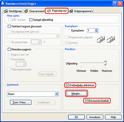 Klik op het tabblad Paginalay-out en schakel het selectievakje Dubbelzijdig afdrukken in. Schakel vervolgens het selectievakje Gevouwen boekje in.