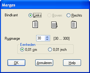 De werkelijke rugmarge kan afwijken van de opgegeven instellingen. Dit hangt af van de toepassing waarmee u werkt. Probeer daarom eerst een paar vellen uit om te zien wat het resultaat zal zijn, voordat u de volledige afdruktaak afdrukt.