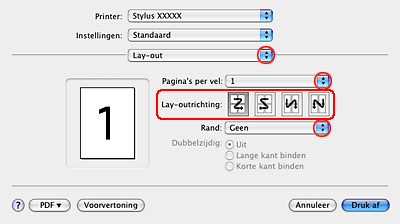 Selecteer Staand (verticaal) of Liggend (horizontaal) om de afdrukstand van het document op het papier op te geven.