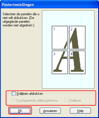 Hiermee worden op de panelen dunne lijnen afgedrukt die u als leidraad kunt gebruiken bij het afsnijden van de pagina's.