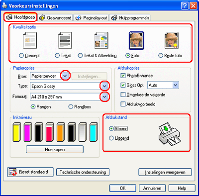 Klik op het tabblad Hoofdgroep en selecteer een van de volgende instellingen bij Kwaliteitoptie: