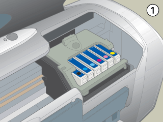 Druk op de inktknop . De printkop gaat naar de positie waar de cartridge kan worden vervangen en het aan-uitlampje begint te knipperen.