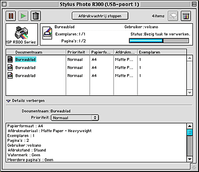 Nadat u een afdruktaak naar de printer hebt gestuurd, kunt u met behulp van het hulpprogramma EPSON MonitorIV afdruktaken die in de wachtrij staan bekijken, annuleren of in een andere volgorde zetten. Het hulpprogramma toont bovendien de status van de huidige afdruktaak.