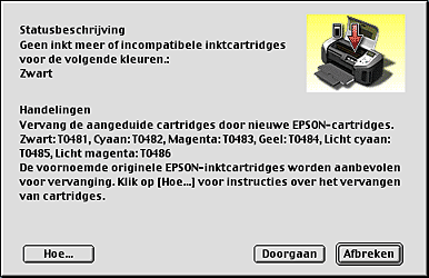 Als de inkt (bijna) op is, verschijnt onder het tekstvak een knop Hoe. Als u op Hoe klikt, wordt u door EPSON Status Monitor 3 stap-voor-stap begeleid bij de procedure voor het vervangen van de cartridge.