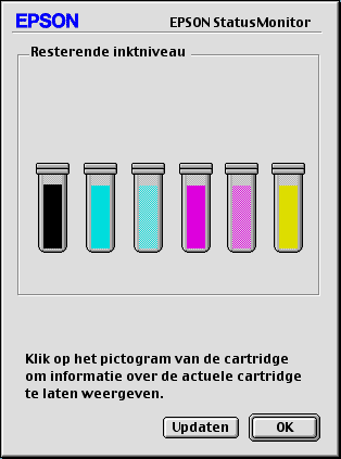 U kunt dit programma ook gebruiken om vóór het afdrukken het inktniveau te controleren. EPSON StatusMonitor toont hoeveel inkt er nog was op het moment dat u het programma opende. Als u de informatie over de hoeveelheid resterende inkt wilt actualiseren, klikt u op Updaten.