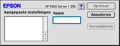 Typ een unieke naam voor uw instellingen in het vak Naam en klik vervolgens op Opslaan (Save). De naam kan maximaal 16 letters en cijfers bevatten. U kunt ook maximaal acht tekens met dubbele bytes gebruiken. De mogelijkheid bestaat echter dat deze tekens niet goed worden weergegeven op het scherm. Dit hangt af van de instellingen van uw besturingssysteem. Uw aangepaste instellingen worden toegevoegd aan de lijst Aangepaste instellingen en de laatste aangepaste instellingen worden geselecteerd. U kunt maximaal honderd verschillende aangepaste instellingen opslaan.