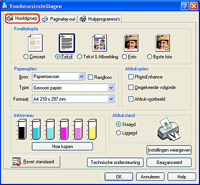 Via het tabblad Hoofdgroep kunt u de instellingen vastleggen voor Kwaliteitoptie, Papieropties, Afdrukopties, Afdrukstand en een aantal geavanceerde instellingen. Ook kunt u hier de inktniveaus controleren. Raadpleeg het betreffende gedeelte hierna.