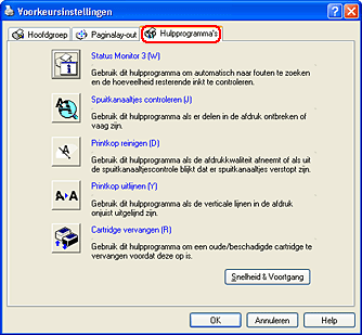 Als u de hulpprogramma's wilt gebruiken, klikt u in de printersoftware op het tabblad Hulpprogramma's en klikt u vervolgens op de knop voor het hulpprogramma dat u wilt gebruiken. Raadpleeg het hierna genoemde gedeelte voor informatie over het openen van de printersoftware.