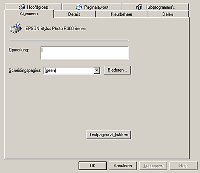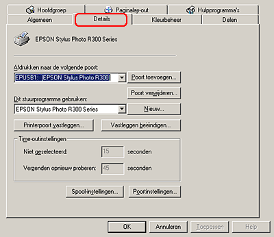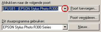 Als EPUSBX: (EPSON Stylus Photo R300) wordt weergegeven in de keuzelijst Afdrukken naar de volgende poort, dan zijn de printerdriver voor de USB-printer en de printersoftware correct geïnstalleerd. Als de juiste poort niet is geïnstalleerd, gaat u door met de volgende stap.