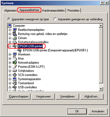 Als de drivers correct zijn geïnstalleerd, wordt EPSON USB-Printer in Apparaatbeheer (Device Manager) weergegeven.