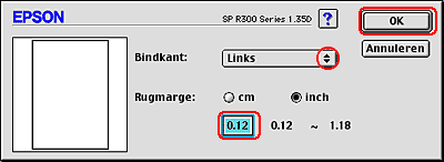 Geef de breedte van de rugmarge op in het tekstvak. U kunt een breedte invoeren van 0,12 inch tot 1,18 inch of van 0,3 cm tot 3,0 cm.